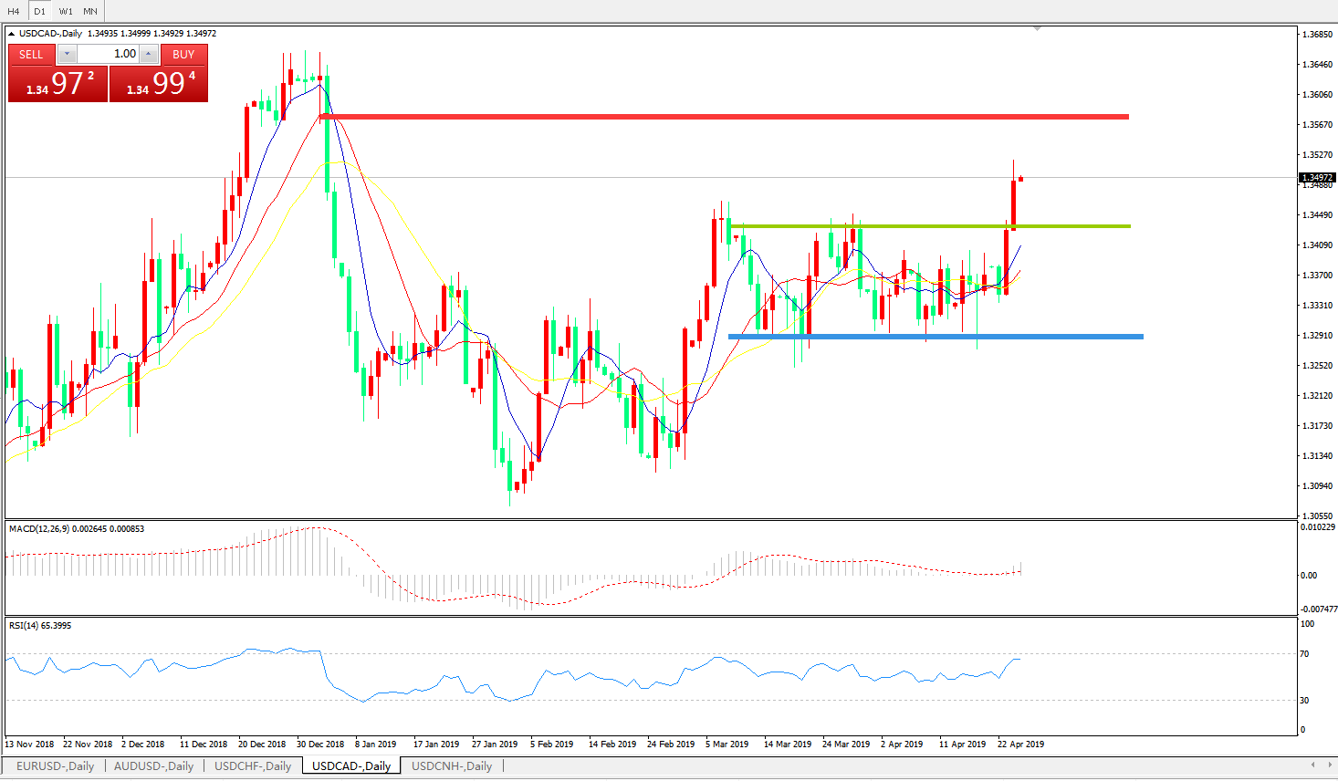 加拿大央行公布了4月利率政策决议,维持利率水平在1.75%不变,但取消了今年的加息预期。此外,加拿大央行将2019GDP增长预期降至1.2%,此前为1.7%,并且将中性利率区间预估自2.5~3.5%降至2.25~3.25%。加拿大央行行长波洛兹表示,经济增长低于趋势水平将是暂时性的,预计下半年会得到提振。他认为加拿大原油进入全球油市的程度有限,这是一个明显的负面因素,并且带来不确定性。加拿大央行的鸽派论调引发加元急跌,美元兑加元急速拉升。