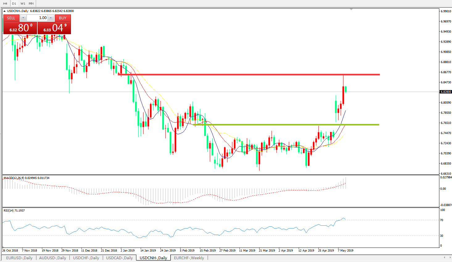交易策略6.7560之上,看涨,目标价位为6.8585,然后为6.9200