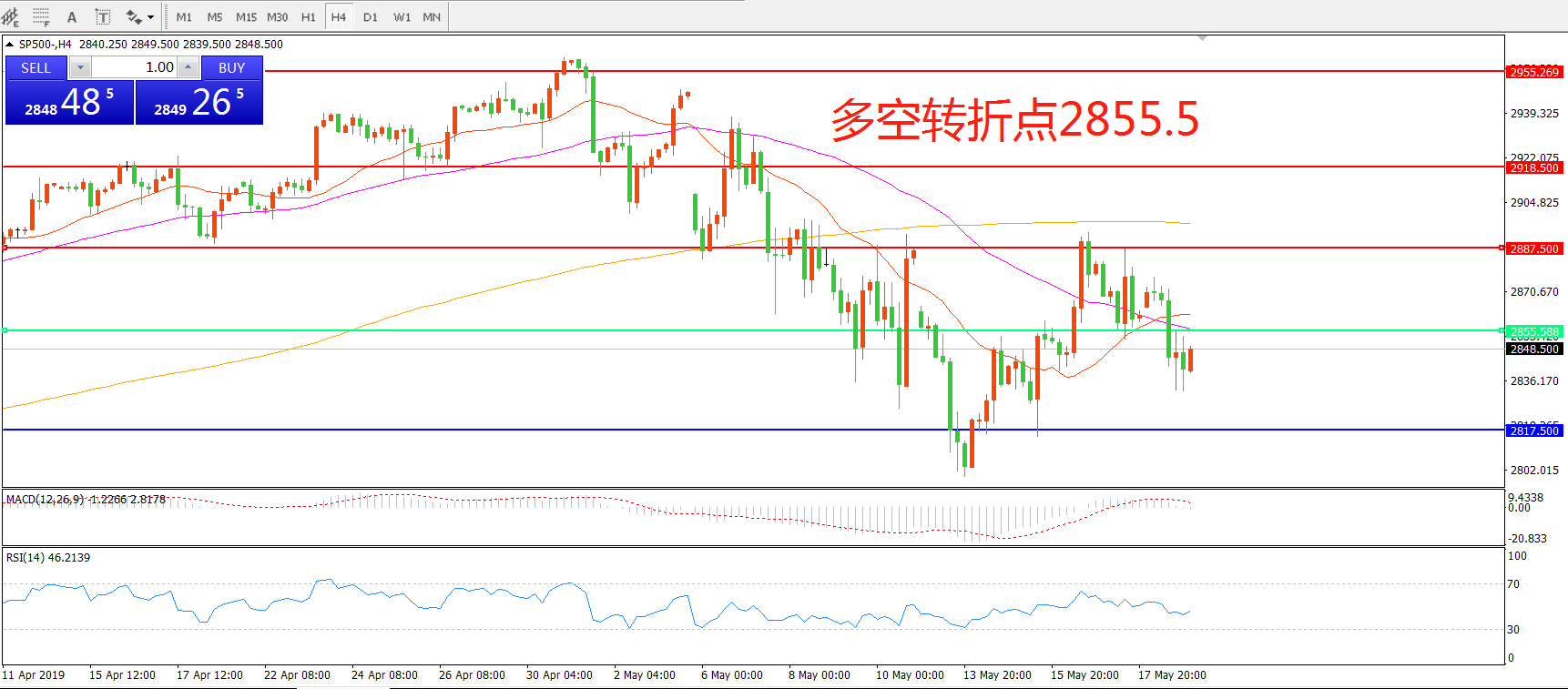 4小时图看,标普500阳整体呈现宽幅震荡形态,价格跌破短期支撑2855.5,21均线走平,55均线逐渐下移, MACD红柱减少,日内预计震荡下行为主。