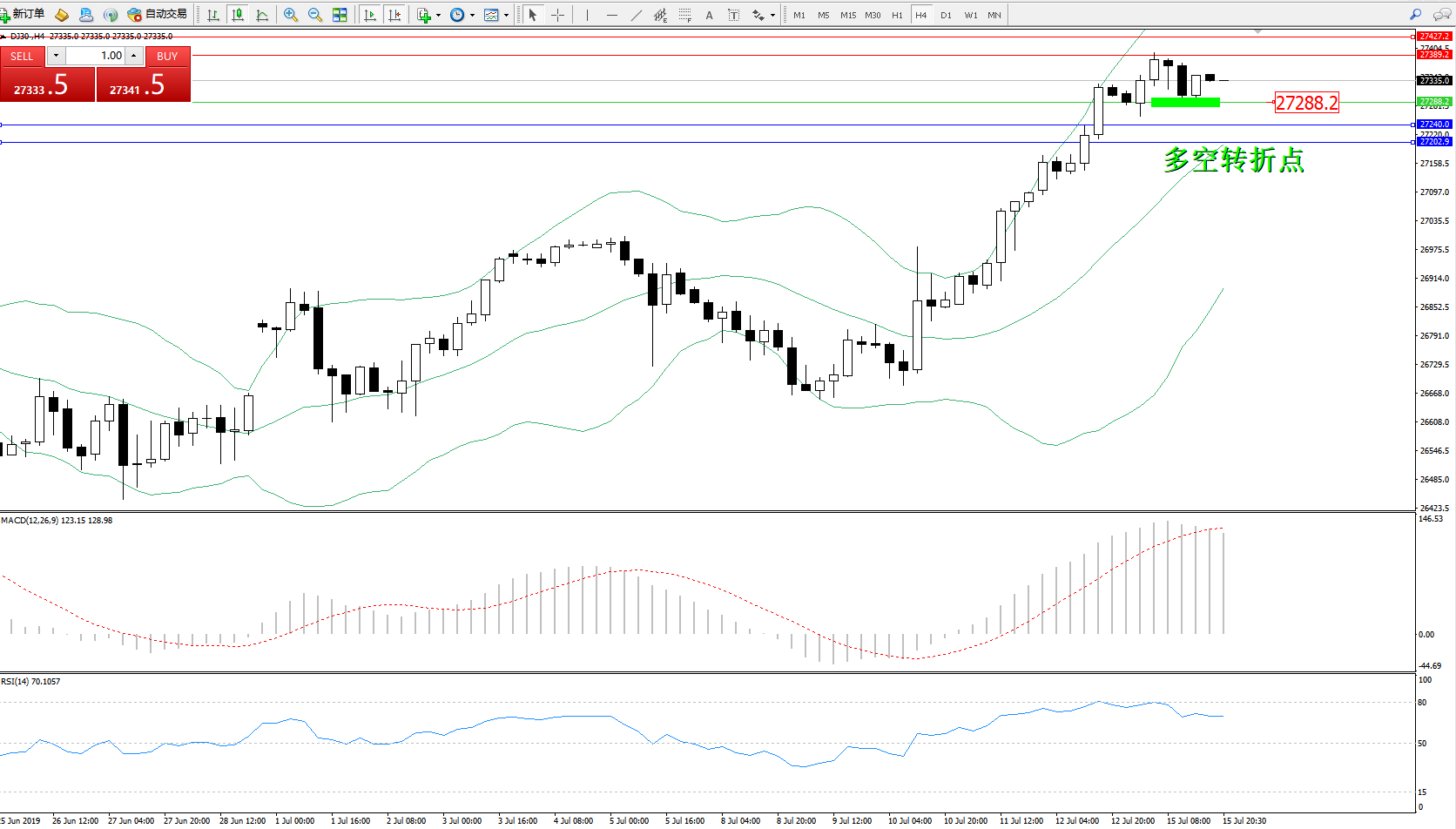 道琼斯指数7月15日(周一)收盘上涨27.10点,涨幅0.10%,报27359.16点。美国7月纽约联储制造业指数4.3,好于预期及前值。市场正期待本周美联储官员能在周末新一轮“噤声期”开始前透露更多进一步的消息。市场会开始提前预估押注月底美联储决议的前景。在暂无进一步负面消息的背景下,美指缺乏下破动能,投资者都在等待美联储更多官员讲话的指引。