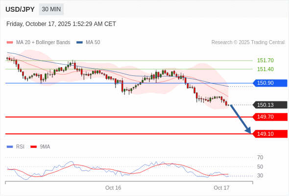 在 150.90 之下,看跌,目标价位为 149.70 ,然后为 149.10 。