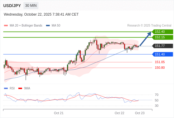 在 151.40 之上,看涨,目标价位为 152.15 ,然后为 152.40 。