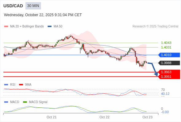 美元/加元 当日内 : 看跌,在 1.4010 之下。