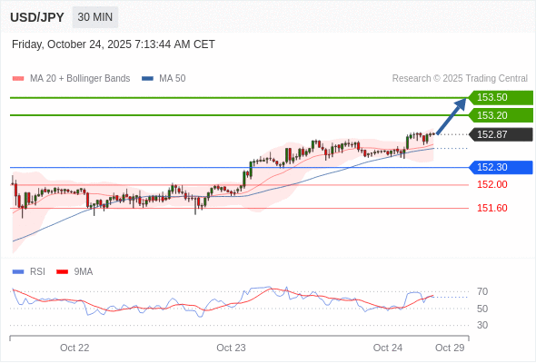 在 152.30 之上,看涨,目标价位为 153.20 ,然后为 153.50 。