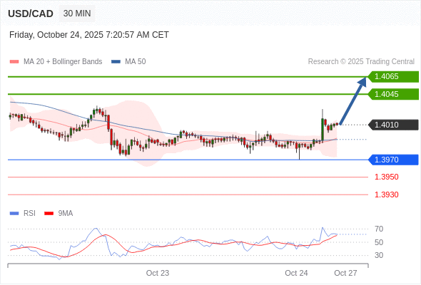 在 1.3970 之上,看涨,目标价位为 1.4045 ,然后为 1.4065 。