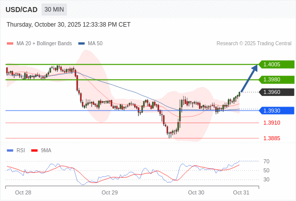 在 1.3930 之上,看涨,目标价位为 1.3980 ,然后为 1.4005 。