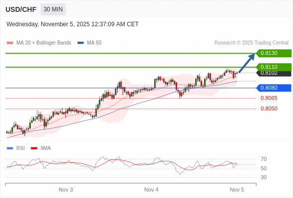在 0.8080 之上,看涨,目标价位为 0.8110 ,然后为 0.8130 。