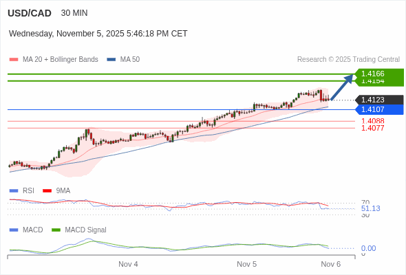 美元/加元 当日内 : 看涨,当 1.4107 为支撑位,目标定在1.4166。