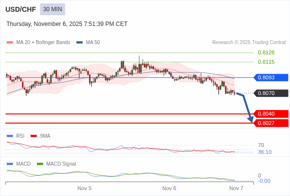 美元/瑞郎 当日内 : 看跌,在 0.8093 之下。