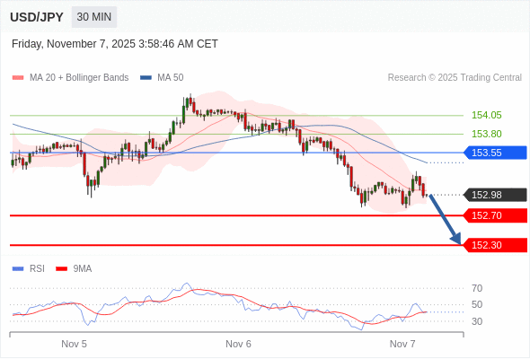 在 153.55 之下,看跌,目标价位为 152.70 ,然后为 152.30 。