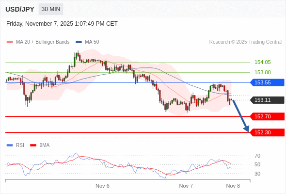 在 153.55 之下,看跌,目标价位为 152.70 ,然后为 152.30 。