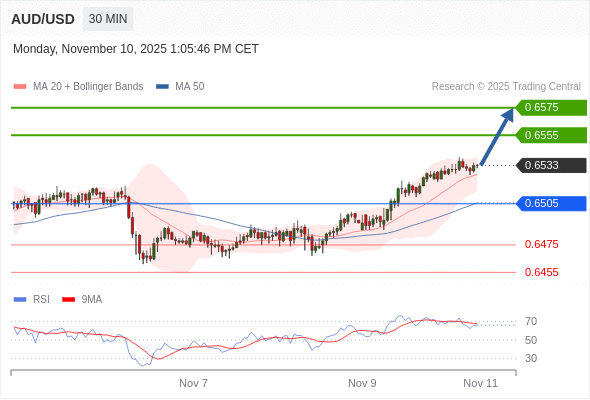 在 0.6505 之上,看涨,目标价位为 0.6555 ,然后为 0.6575 。