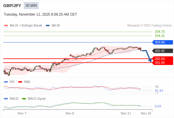 英镑/日元 当日内 : 看跌,当 203.66 为阻力位。