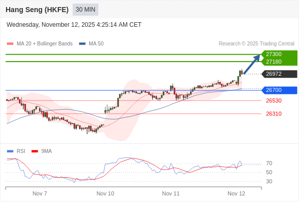 香港恒生指数期货 当日内: 朝27300运行。