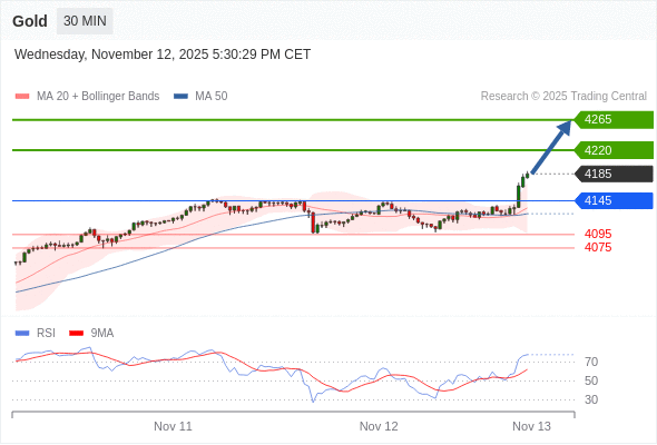 在 4145 之上,看涨,目标价位为 4220 ,然后为 4265 。