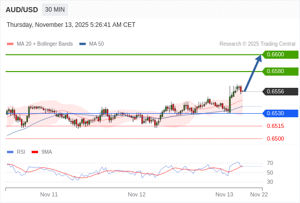 在 0.6530 之上,看涨,目标价位为 0.6580 ,然后为 0.6600 。