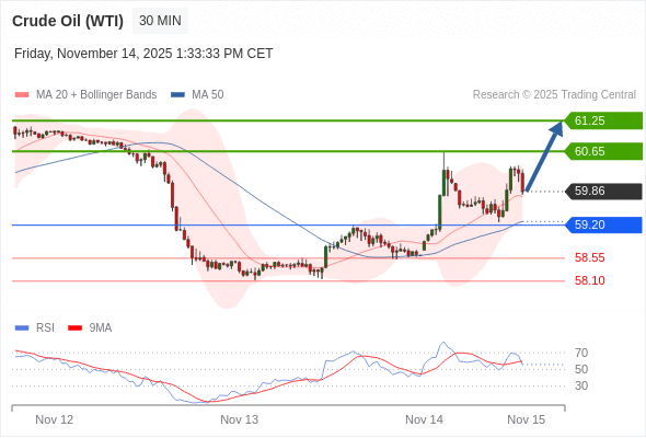 在 59.20 之上,看涨,目标价位为 60.65 ,然后为 61.25 。