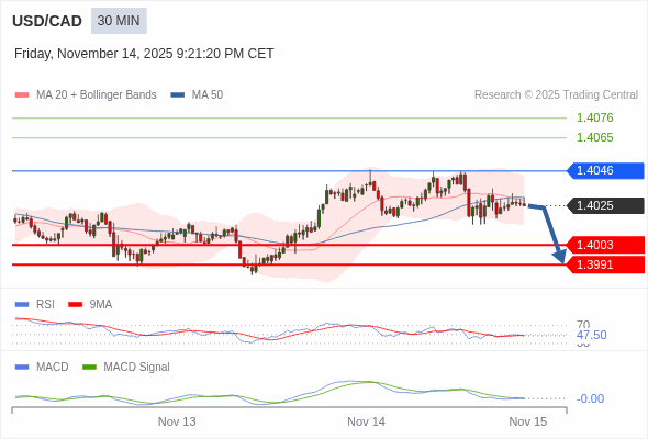 美元/加元 当日内 : 看跌,在 1.4046 之下。