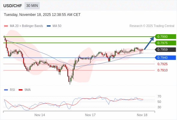美元/瑞郎 当日内: 在0.7940之上,看涨。