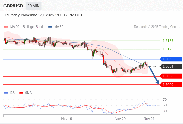 在 1.3090 之下,看跌,目标价位为 1.3030 ,然后为 1.3000 。