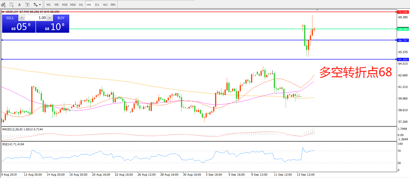 周六沙特最大原油设施遭无人机袭击,导致逾500万桶/日产能暂停,受影响的产油量占沙特当前产油量的一半,油价周一收盘暴涨约13%,布伦特原油周一收涨14.6%,报68.05美元/桶,创2008年6月6日以来最大单日涨幅。供应危机和中东地区可能会陷入战争的担忧引爆了市场中的避险情绪。