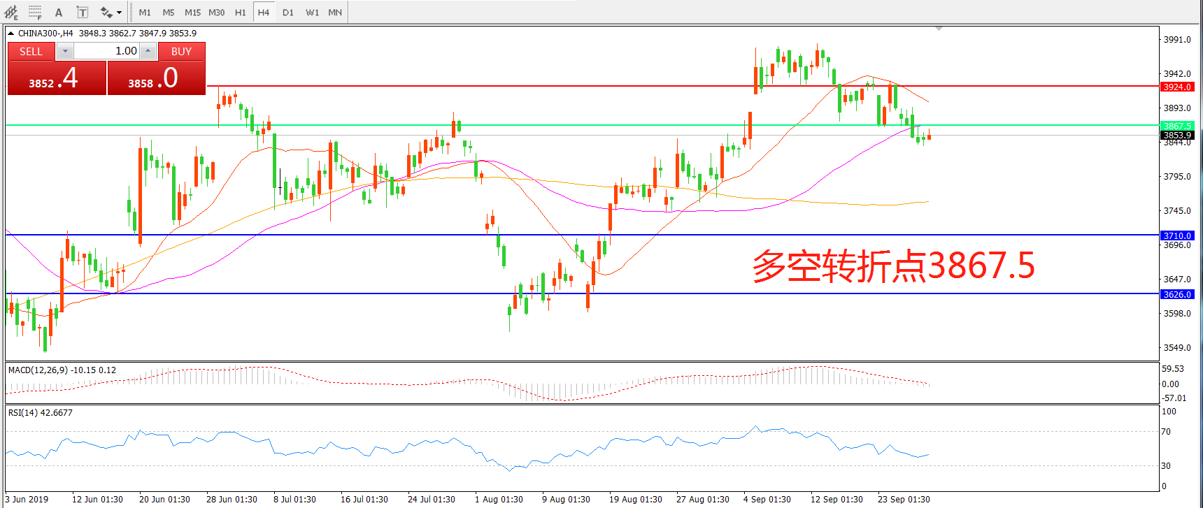 4小时图看,沪深300延续下行,3867.5被跌破后,整体走势偏弱,MACD红柱减少,RSI指标向下,日内依然有回落风险。