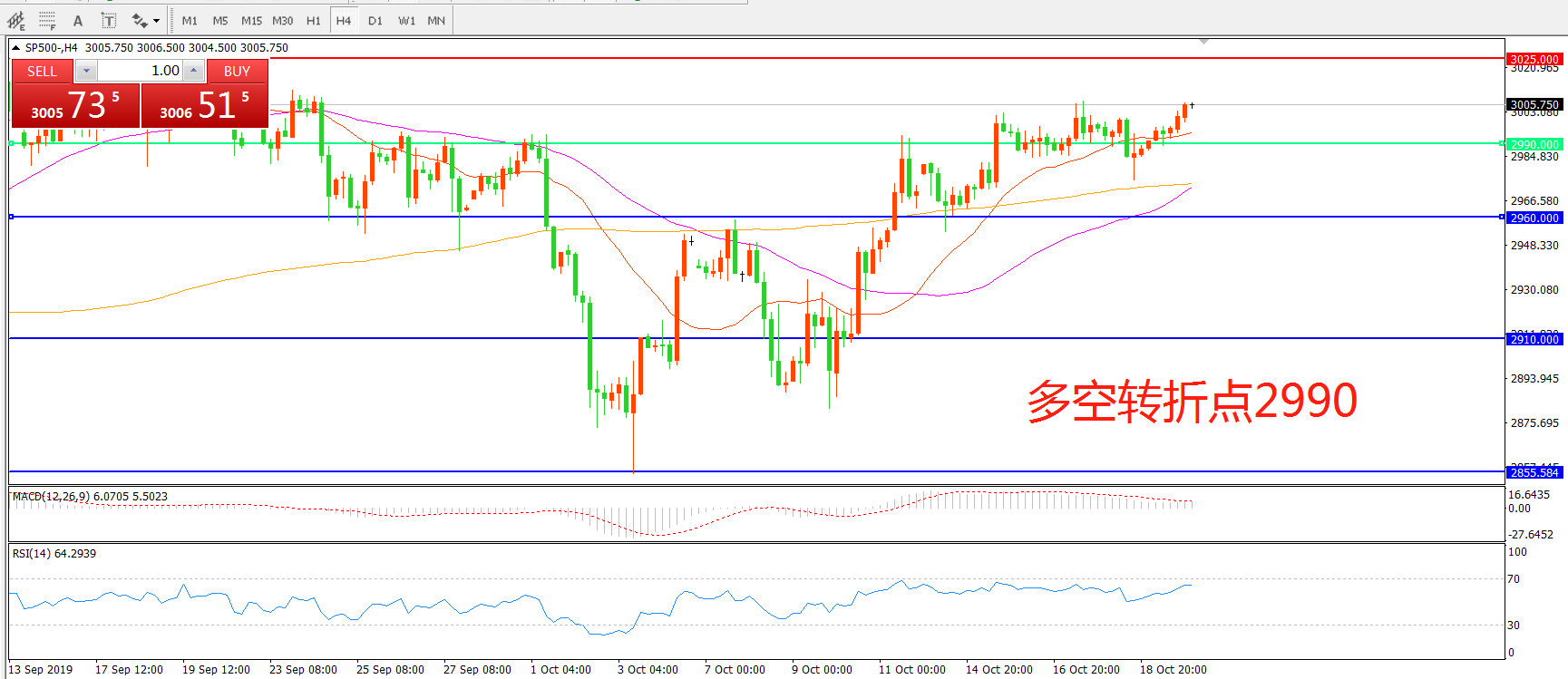 4小时图看,标普500震荡走高,2990关口突破后,整体走势偏强,MACD红柱减少,RSI指标走平,日内延续上行概率较大。