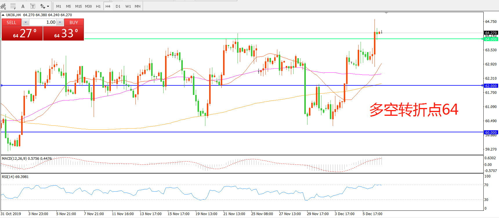 4小时图看,油价阳线连续拉升,一度突破64附近阻力,整体走势偏多,均线系统走平,MACD红柱增加,RSI指标走平,日内延续上行概率较大。