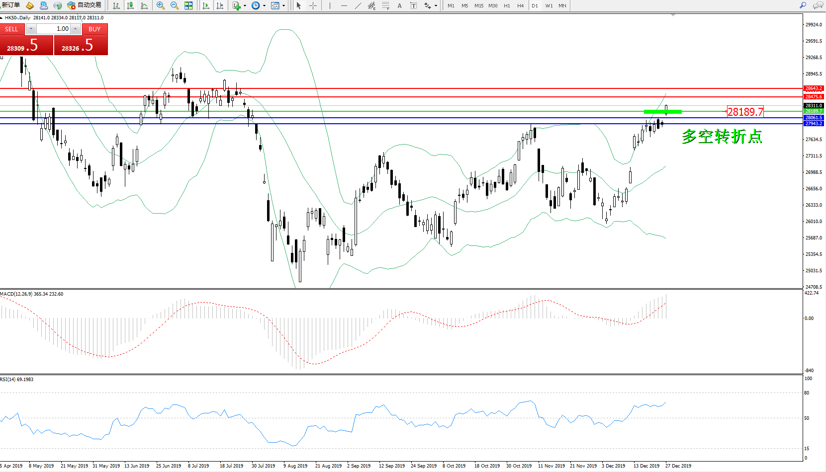 香港恒生指数1227日(周五)收盘上涨361.21点,涨幅1.30%,报28225.42点;美国股市在圣诞假期后复市再续造好,由于中美双方明言已密切联系,正准备签署协议。消息刺激美股三大指数再度高开高收,并再创出52周历史新高。港股在假期后开市,跟随外围造好而高开169点,恒指直冲上28033,曾收窄升幅至近28000关口。唯有买盘支持,未有跌穿28000关口,并再向上扩大升幅,高见28226,并创出近6个月高位。 在情绪没有恶化,市场尚无消息改变趋势的前提下,港股可能会有一波行情,这是多方努力的结果。