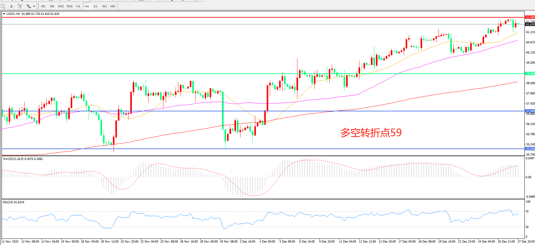 交易策略: 在59.00 之上看涨,目标62.00        65.00