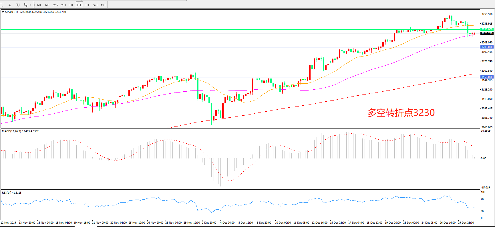 4小时图看,标普500连续冲高后小幅回落,但整体表现依然处于多头趋势,均线系统呈多头排列,MACD红柱减少,RSI指标走平,日内延续震荡概率较大。