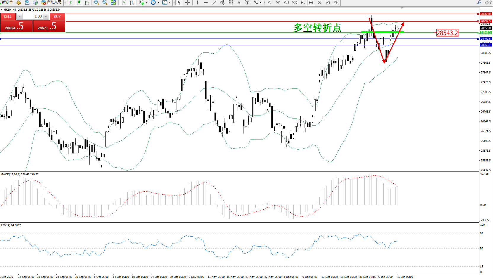 香港恒生指数1月10日(周五)收盘上涨77.20点,涨幅0.27%,报28638.20点;港股昨天升至最高位收市。早上再高开104点,恒指高见28665,已见是日高位。曾回落倒跌42点,续在升跌附近徘徊至收市。 中东紧张局势急速缓和,商务部确认下周率团访问华盛顿,与美方签署第一阶段经贸协议,当前市场情绪高涨,预计恒指短期仍将继续处于上升状态。
