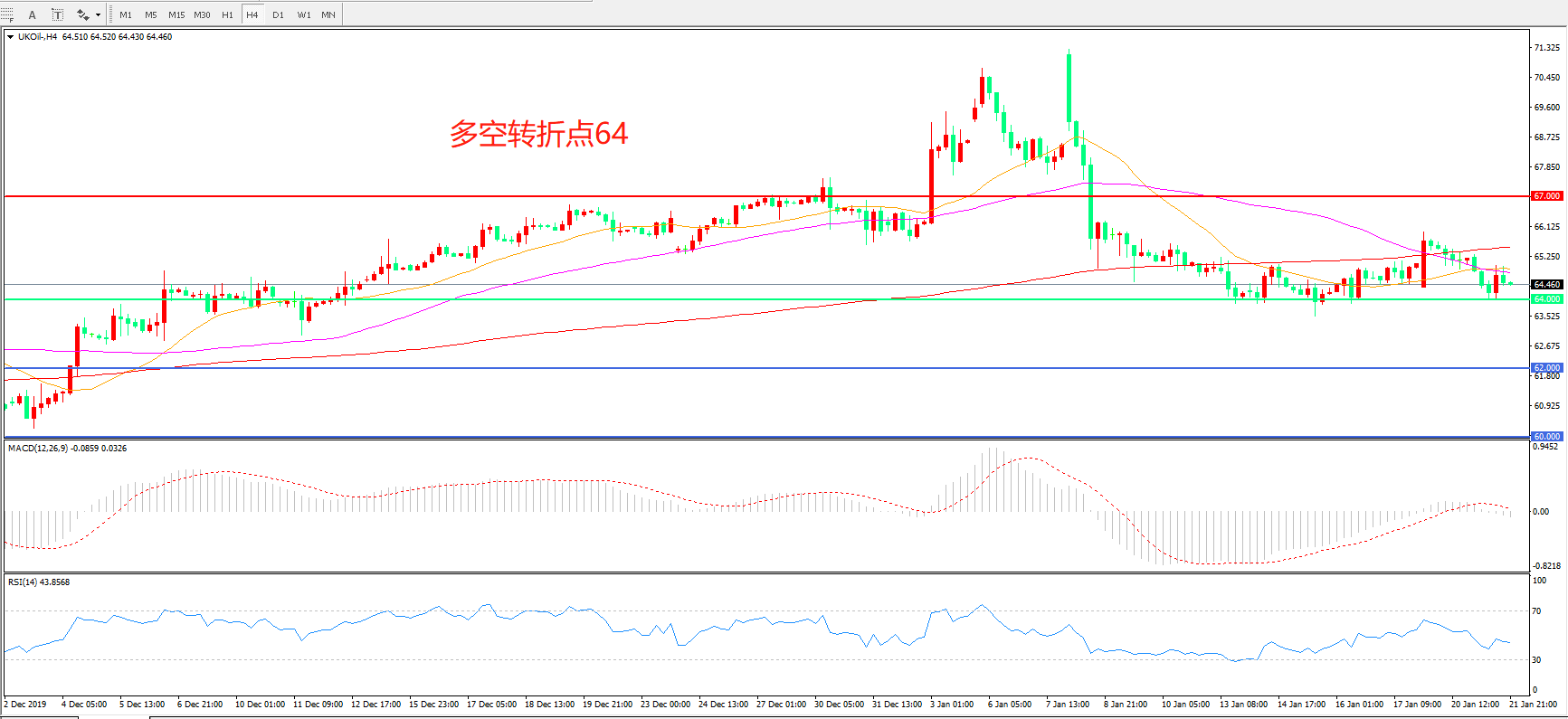 4小时图看,油价延续低位震荡走势, 64美元仍是短期多空分水岭,如能顺利突破站稳,行情有望迎来反弹,均线系统走平,MACD绿柱减少RSI指标向上,日内震荡上行概率较大。