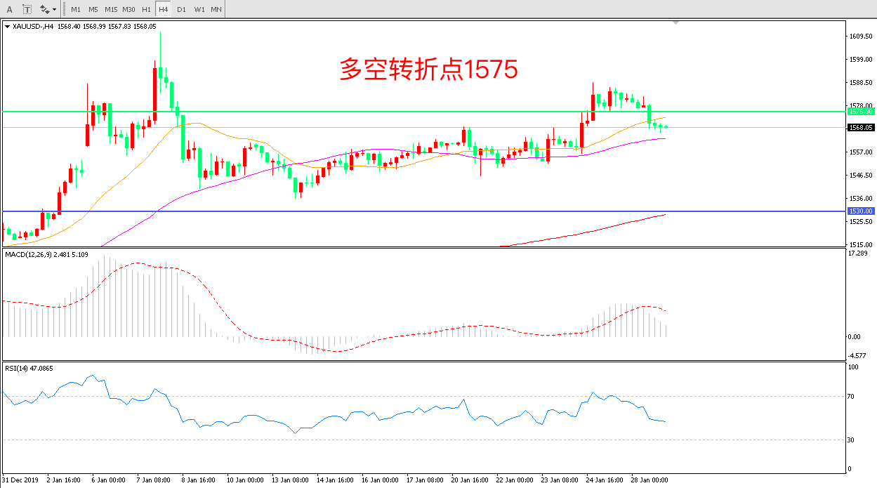 4小时图看,金价冲高回落跌破1575支撑短线走势有所回调均线系统走平 MACD红柱缩短RSI指标,日内维持震荡概率较大。