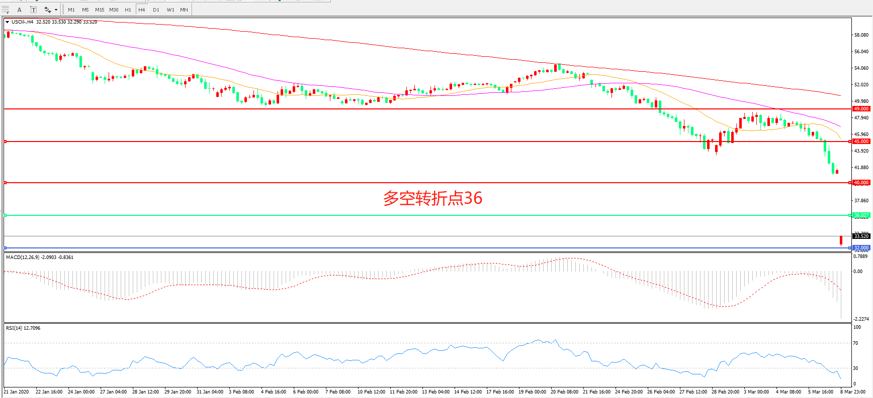 周一美国WTI原油大幅低开近20%,创造了历史,截止发稿前小幅反弹,收报33.04美元/桶。