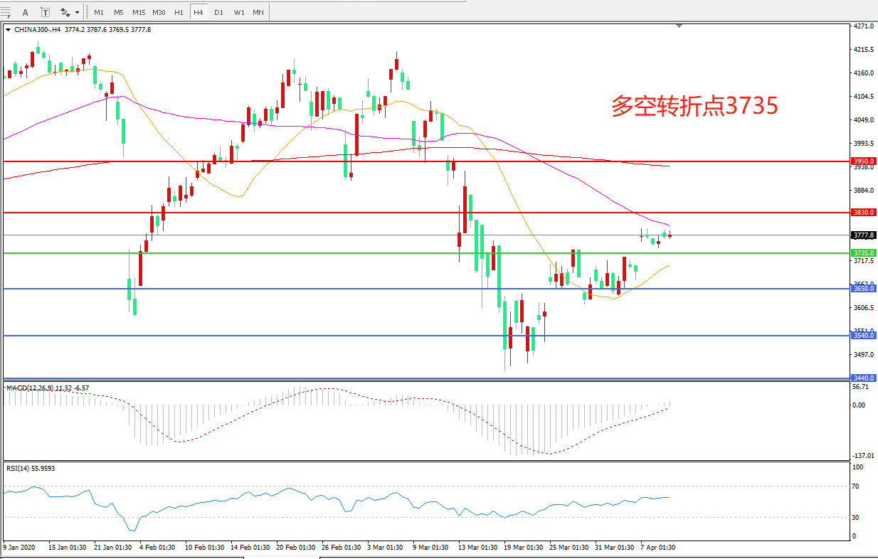 4小时图看,沪深300维持窄幅震荡,整体波幅不大,短期均线拐头向上,MACD绿柱缩短,RSI指标走平,日内延续上行概率较大。