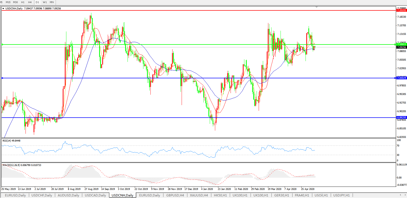 技术面简析:日图均线延续多头排列但快速拐头下行,汇价跌落至7.10关口下方后小幅反弹,MACD小幅走升但量能缩量,RSI持续走低,预计短期汇价或将进一步下行。