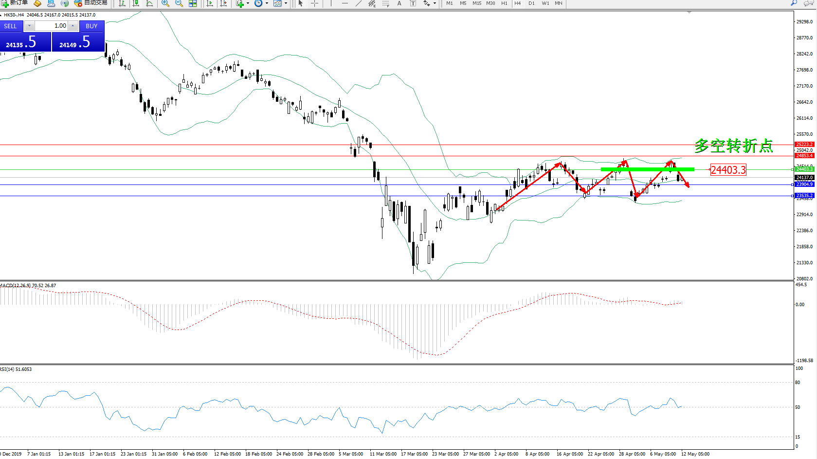 香港恒生指数512日(周二)收盘下跌356.38点,跌幅1.45%,报24245.68点;港股市场三大指数均大跌超1.4%。早盘恒指走高已经触及到本轮反弹的高位,午后受压回落,表明上方压力较大,当前重点关注24850附近的压力,中石油、中石化跌近3%,三大电信股皆跌超1.5%,太古股份公司大跌4.64%领跌蓝筹;医疗设备、乳制品逆势走强,微创医疗大涨超10%创新高,春立医疗、爱康医疗皆升超8.6%。主板成交额不足千亿港元,南下资金逆势净流入28.52亿港元。市场憧憬经济重启,恒指向上突破有难度。腾讯昨天收到京东可能来港上市消息带动股价破顶,今天则再度回调超过2%