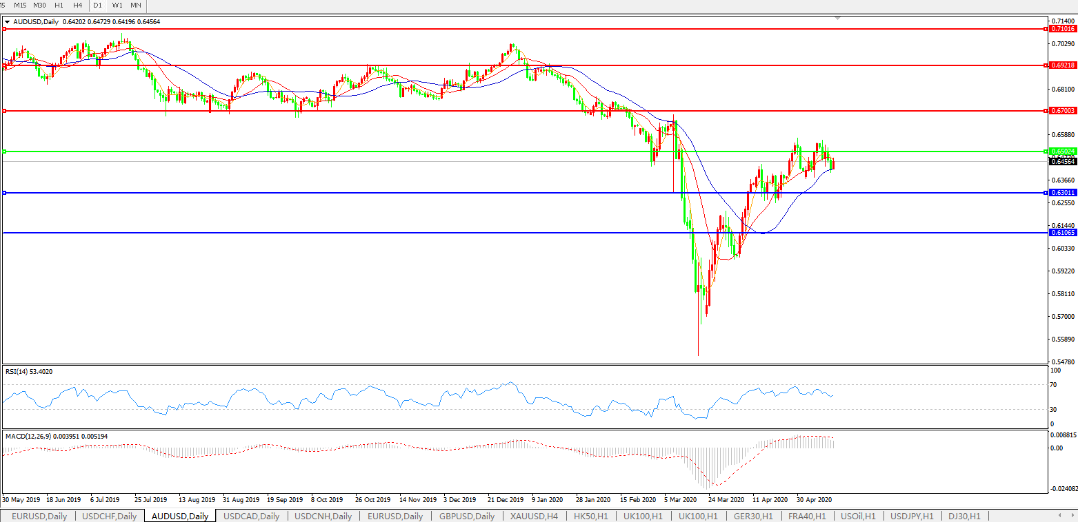 澳元兑美元在周四亚市早盘澳洲就业数据出炉后膝跳反射式地跌至一周低位0.6421,之后;略有回升,但整体颓势未改。虽然澳洲就业报告得到了进一步解读后仍被视作“好于预期”,但美元的强盛依旧遏制了非美货币的走势;早间数据显示,澳洲失业人数在此前因全球疫情创出“史上最大”增幅,不过,其失业率水平仍然低于市场此前普遍预期,这一状况令澳元回家在短时跳跌后收复部分跌幅,但弱势格局并未彻底扭转,因全球风险情绪再度吃紧,美元避险买需仍获追捧,隔夜美联储主席鲍威尔承诺短期不考虑负利率的状况,也令美元指数牛头抬升; 市场正在观望此后发布的美国失业金申领人数,数据若进一步透露经济领域的负面格局,料进一步强化美元的避险买需。在日低0.6421下方,澳元兑美元讲考验0.64关口,之后是前期低位0.6379。