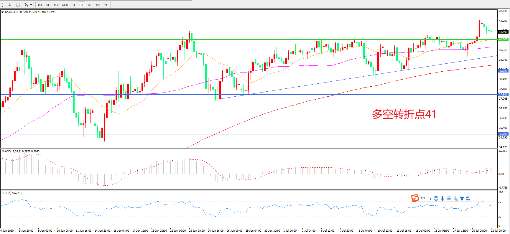 周二(7月21日),欧盟达成了7500亿欧元(折合人民币约6万亿)的疫情后经济复苏计划,而美国财长姆努钦表示,总值万亿美元(折合人民币超7万亿)的刺激计划正在开始制定,市场对各国财政刺激预期下的能源需求前景持乐观态度,美国WTI原油趁势上行,收报41.60美元/桶。
