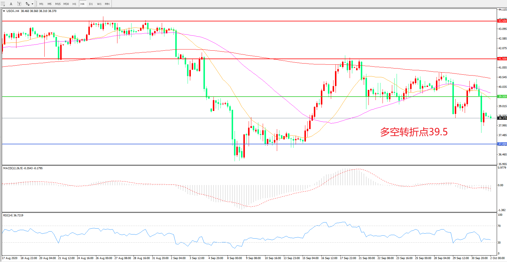周四(10月1日),国际油价表现凄凉,美国WTI原油盘中一度暴跌超6%,尾盘小幅回升后收报38.40美元/桶。自9月初原油打破僵局,重心下移之后,原油转入新一轮的振荡区间,当前原油虽然表现为横盘振荡,但波动区间显著下移,而且,波动过程中原油仍然存在进一步下破的风险。