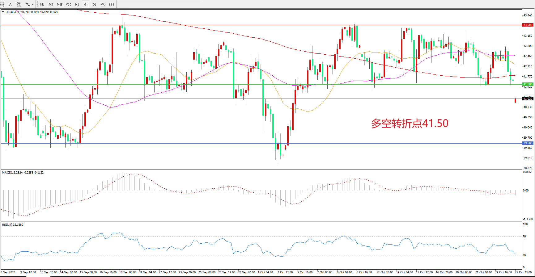 在刚刚过去的一周,美国新刺激方案的不确定性和利比亚增加出口的前景共同施压,市场对原油需求前景的担忧再度加重,布伦特原油跌逾3%,收报41.63美元/桶。美国单日新增病例超国8万,为疫情爆发以来最高,而欧洲第二波疫情形势持续恶化冲击了未来的经济潜力及原油需求前景。 布伦特原油今日开盘进一步下挫,截止发稿前跌至41.00美元/桶,创10月5日以来新低。