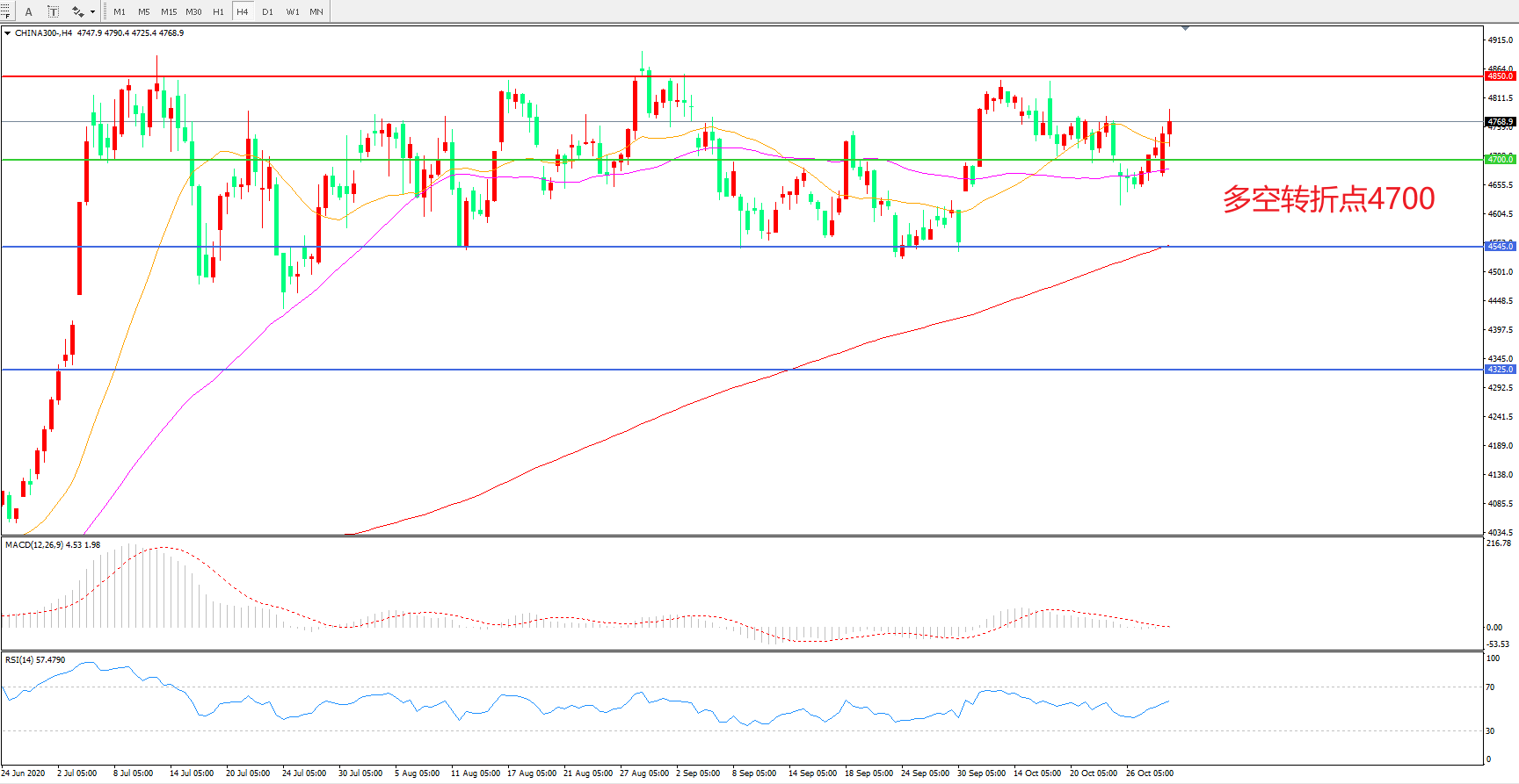 周四(10月29日),A股受欧美市场暴跌影响大幅低开,触及箱体底部遭到多头顽强抵抗,权重集体发力,韧性彰显。三大指数集体翻红,沪深300长阳拉升后收报4768.9点。两市成交额7802.73亿元,较周三增长6.54%。国内疫情管控得力、经济有力复苏,构成了市场坚挺的最大支撑。