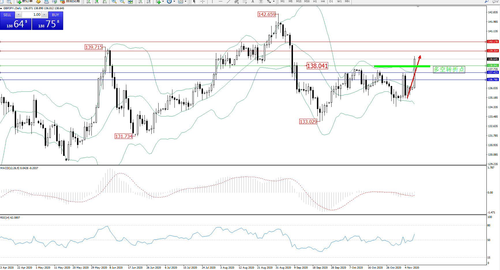 交易策略:138.041上方看涨,目标139.354、140.178