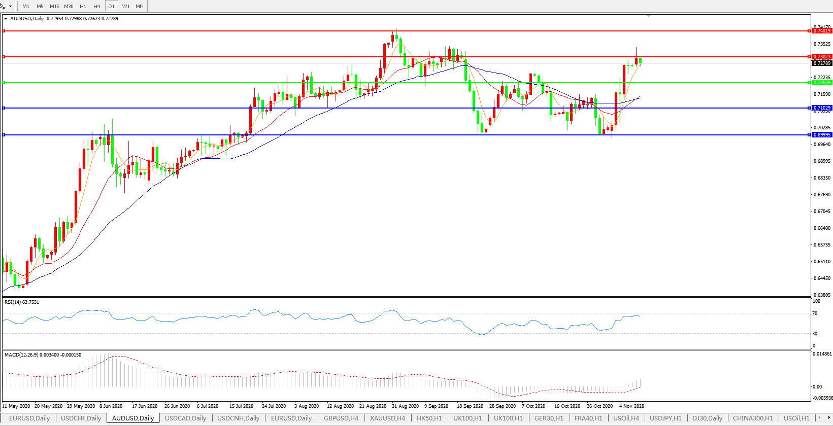 交易策略:0.7200上方看涨,目标0.7300、0.7400