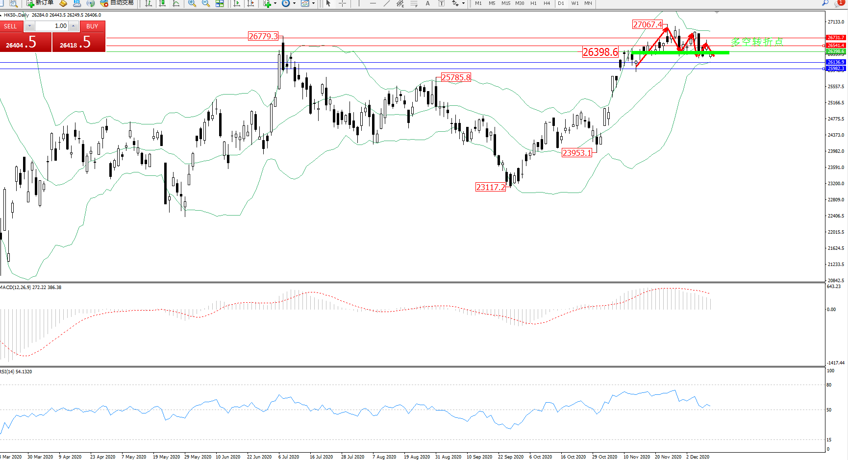 香港恒生指数12月10日(周四)收盘下跌92.25点,跌幅0.35%,报26410.59点;港股主要指数全天弱势,市场情绪表现低迷。恒生科技指数跌0.94%。手机概念股跌幅靠前,舜宇跌逾3%,手游股、在线教育股、汽车股纷纷下跌,石油股延续昨日跌势;恒生科技股跌多涨少,大型科技股网易跌超4%,阿里、腾讯、京东皆下跌。今日南下资金净流入28.09亿港元,大市成交额为1100.01亿港元。据香港电台,香港特区政府卫生署卫生防护中心12月10日下午表示,香港新增112例新冠肺炎确诊病例,连续3天日增超百例,其中102例为本地病例,34例源头不明个案。据央视,在今天的外交部例行记者会上,外交部发言人华春莹表示,鉴于美方利用涉港问题严重干涉中国内政,损害中方核心利益,中方决定对在涉港问题上表现恶劣、负有主要责任的美国行政部门官员、国会人员、非政府组织人员及其直系亲属实施对等制裁。同时,中方决定取消美方持外交护照人员临时访问香港、澳门免签待遇。中方再次敦促美方立即停止插手香港事务,停止干涉中国内政,不要在错误和危险的道路上越走越远。