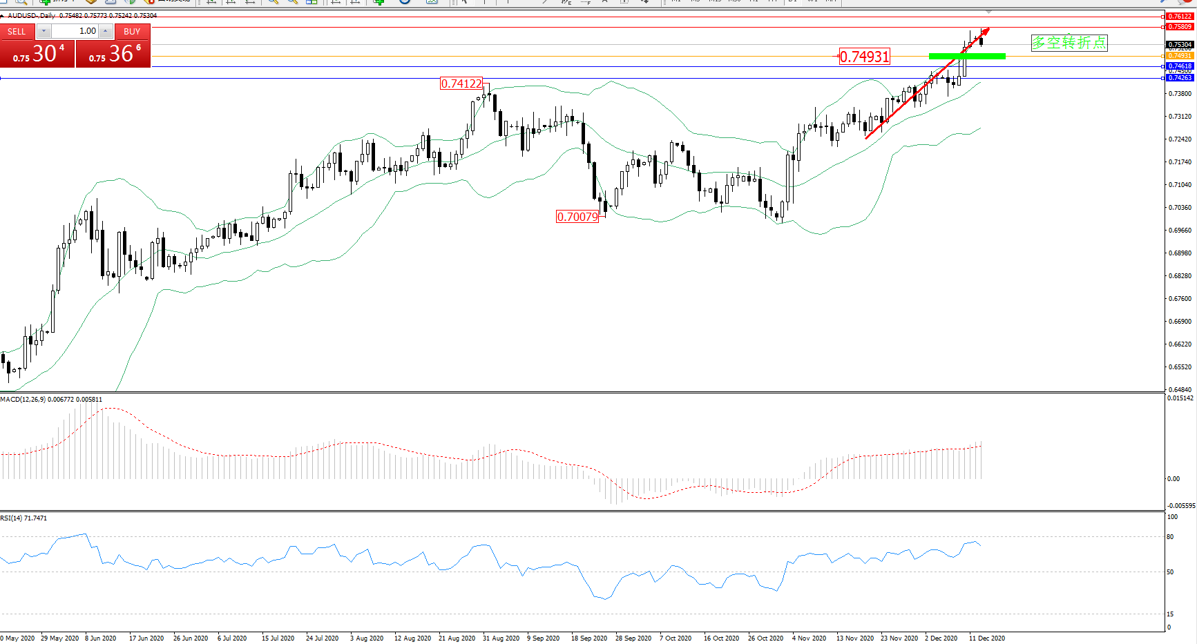 交易策略:0.74931上方看涨,目标0.75809、0.76122