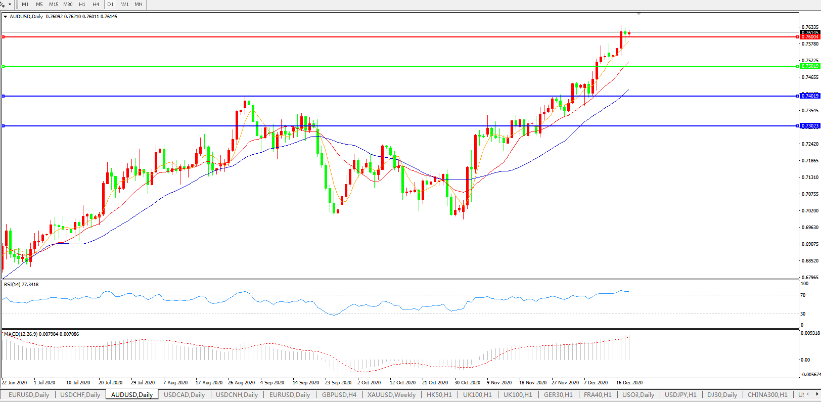 交易策略:0.7500上方看涨,目标0.7600、0.7700