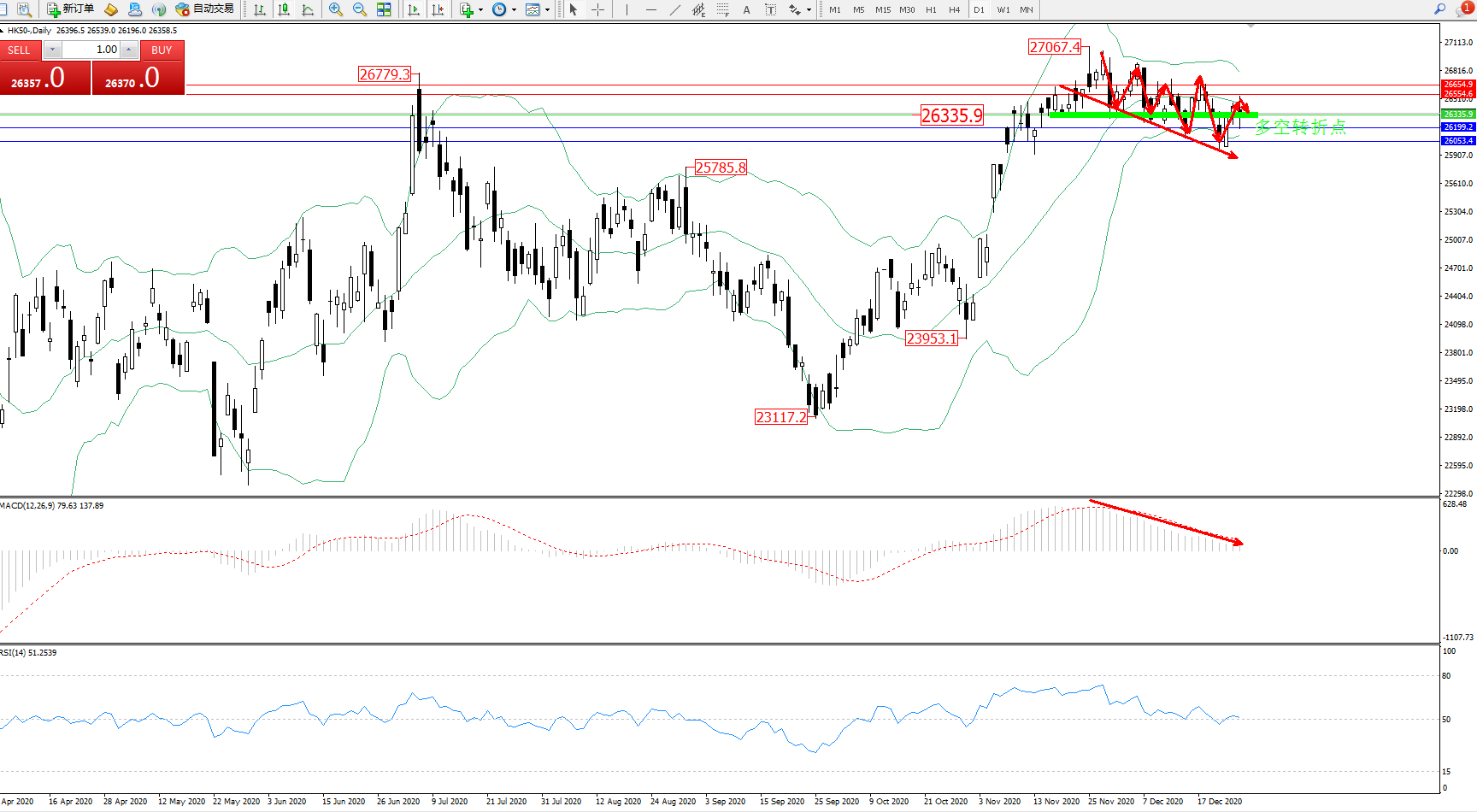 香港恒生指数12月28日(周一)收盘下跌71.93点,跌幅0.27%,报26314.63点;港股主要指数均收跌,因大型科技股全线重挫,恒生科技指数大幅收跌4.26%报7795点。阿里大跌8%、美团大跌6.88%,拖累恒指下挫超190点,腾讯跌6.6%亦拖累恒指下跌176点;保险股、石油股、银行股等权重撑市,一定程度上抵消科技股的大跌拖累;半导体、餐饮、手机概念股则全天低迷。今日南下资金逆势净流入89.93亿港元,大市成交额放大至1907.35亿港元。2021年港股是价值重估与创新成长双轮驱动的指数牛市,有望超过20%。港股牛市预计会呈现两大路径:经济复苏驱动的价值重估行情仍将延续,至少有望延续到明年1季度;另外,2021年中期之后,行情的主旋律依然又会回到中国高质量发展的长期趋势和主赛道。