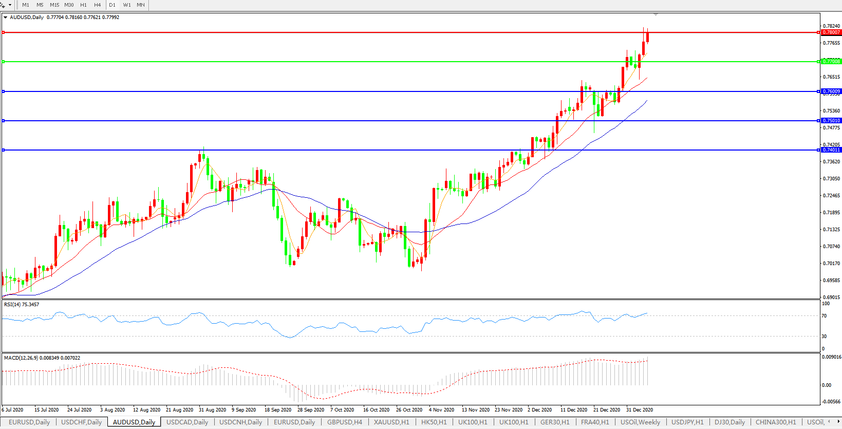 澳元兑美元汇价周四亚市早盘在澳洲贸易数据发布后,自此前创得的两年多高位0.7817小幅回落,失守0.78关口,因数据显示去年11月澳洲贸易盈余表现显著不及预期;不过考虑到此前澳大利亚方面遭遇的国际贸易风波以及全球疫情再度升温的影响,这一数据表现本在各方的意料之中,对于市场的影响也料相对短暂及有限。大趋势在于,在美国新政府上任后,其与美联储联手配合推出的新政措施仍将打压美元汇价,而全球经济的趋向复苏,也会令以澳元为代表的商品系货币在年内继续首当其冲走强
